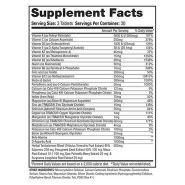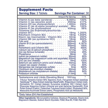 MULTIVITAMIN有益なアスリート向けのフォーミュラ 1つの錠剤に含まれるマルチビタミンおよびミネラル テストステロンとリビドーの増強 大幅に向上した日常の回復力 Testovite™は、アスリートのニーズに特化した世界初のマルチビタミン/ミネラルサプリメントです!Testovite™は、アスリートが要求する栄養ニーズをサポートするよう設計されています。Testovite™には、ビタミンA、C、D、E、K、B1、B2、B3、B5、B6、B7、B9、B12の量が豊富に含まれています。また、アクティブなライフスタイルに必要な多くのミネラルが含まれており、ストレスの多い状況で最適なパフォーマンスを発揮するために必要です。 Testovite™はまた、倫理的なレベルでテストステロンを増強する成分を日々の摂取量で提供する最初のマルチビタミン/ミネラルサプリメントでもあります。また、日々の摂取によるリビドー増強のためのハーブエキスも豊富に含まれています!最初の成分は、業界をリードする90%のサポニン含有量を持つ、強力なトリビュラステレストリスエキスです。トリビュラスは、アスリートの望ましい効果をもたらす可能性があります。パワーリフティングのアスリートは、伝統的にパフォーマンスをサポートするためにトリビュラスを使用してきました。トリビュラスの最も求められる効果は、筋肉質と強さ、全体的なパワーとパフォーマンス、より効率的な回復をサポートすることです。トリビュラスには、気分とリビドーのサポートに関連することもあります。 次に、Testovite™に含まれるFenugreekエキスがTestosurge®として使用されています。TESTOSURGE®の特異性は、テストステロンレベルを劇的に上げるために複数の経路を介して作用することです。これにより、筋肉のサイズ、成長、強度の向上、エネルギー、リビドー、活力、性欲の増加がサポートされます。市場で最も高濃度の活性成分を1ミリグラム当たり含有しており、初回の服用から効果を発揮します!TESTOSURGE®の1回の摂取で、研究者は10時間以内に著しいテストステロンの増加を報告しました!また、この1回の摂取後、運動不足の参加者は全体テストステロンが300%以上増加しました!さらに驚くべきことに、遊離テストステロンレベルが110%増加し、生物学的に活性なテストステロン(アルブミン結合+遊離)がプラセボと比較して220%増加しました。 Testovite™に含まれる次の成分はMacaPure®であり、Macaエキスの「ゴールドスタンダード」です。Maca Pure®には、Naturex NMRテクノロジーを使用して同定された2つの新しい化合物グループが含まれています。これらの化合物はマカピュア®の効力を保証するマカミドとマカエンです。このマカエキスに含まれる他の化合物と共に、これらの構造はセックスとエネルギーを向上させる作用があります。MacaPure®を摂取すると、マカミドとマカエンの量が増加することで、性的活動とスタミナが大幅に増加することが示されています。 Testovite™には、その他の高濃度エキスも含まれています。たとえば、自然の媚薬として知られるEpimedium 10:1エキスは、いくつかの研究でホルモン産生とリビドーに良い効果を持つことが示されています。Epimediumは一酸化窒素のレベルを増加させ、アイカリンによって動脈の平滑筋を弛緩させることで、血液流量(循環)を改善する助けをします。これにより、より多くの血液がペニスに流れ込むことができます。Eurycommia Longifolia 100:1エキスは、Tongkat Aliとしても知られており、Eurycomanoneに標準化されています。研究によれば、Eurycomanoneは血流中の遊離テストステロンの量を増やすことにより、テストステロンがエストロゲンに変換されるのを阻害します。これにより、テストステロンが時間の経過とともに蓄積されることになります。Tongkat Aliは、強力なリビドーサポートとともに、精神的な健康と気分の向上にも役立つことが示されています。最近の研究によれば、遊離テストステロンのレベルを増加させ、リーンな筋肉量を増加させるのに役立ちます。Testovite™には他にもテストステロンとリビドーを増強する成分が含まれており、Dioscorea Nipponica Makino...Regular price $31.25Sale price $31.25 Regular priceUnit price per$49.99 -