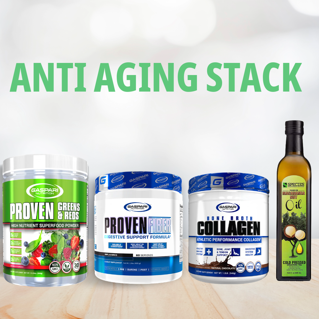 アンチエイジングスタックは、年齢を重ねるごとに失われがちな健康を、内側からサポートするために作られたプレミアムサプリメントセットです。ボーンブロスコラーゲン、ファイバー、Proven Greens & Reds、マカダミアナッツオイルの4つの強力なサプリメントが、関節、消化、免疫、エネルギー、心臓の健康をトータルでサポートし、体全体の健康を維持・向上させます。天然由来の成分だけを使用したこのスタックで、毎日を若々しく、元気に過ごしましょう。
