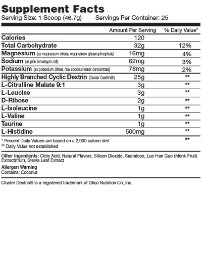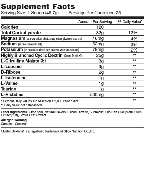 Super bioCARB is the most advanced carbohydrate formula in the industry. Super bioCARB utilizes 25 grams of 100% pure Cluster Dextrin® (Highly Branched Cyclic Dextrin) per scoop. Cluster Dextrin® has a low molecular weight and is extremely soluble, which accelerates gastric emptying. This is incredibly important, as it has the unique ability to enter your system quickly, with no bloating, does not cause insulin spikes, which leads to quickly absorbed, but long lasting, stable energy.*